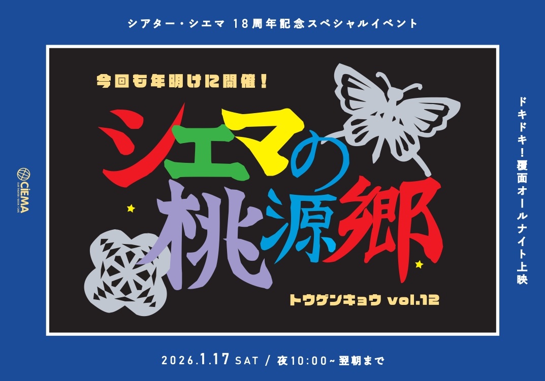 皆さまのご愛顧とお引き立てのおかげをもちまして、シアター・シエマは2025年12月15日で18周年を迎えます。 この記念すべき日を皆さまと分かち合う一夜、今回もやります覆面オールナイト上映! 何の映画を観れるかは、始まるまでのお楽しみ。 後戻りできないシエマ発の暴走...