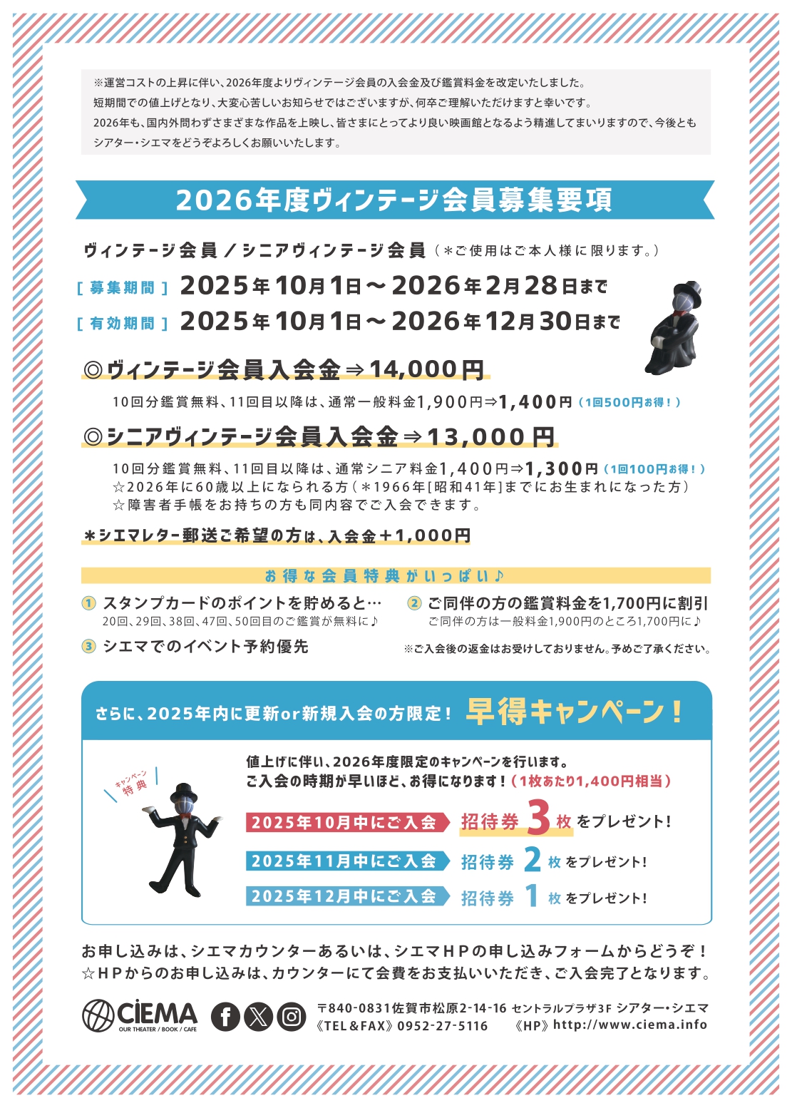 シニアヴィンテージ会員(1966年[昭和41年]までにお生まれになった方)⇒13,000円(※シエマレター郵送ご希望の方は、14,000円)