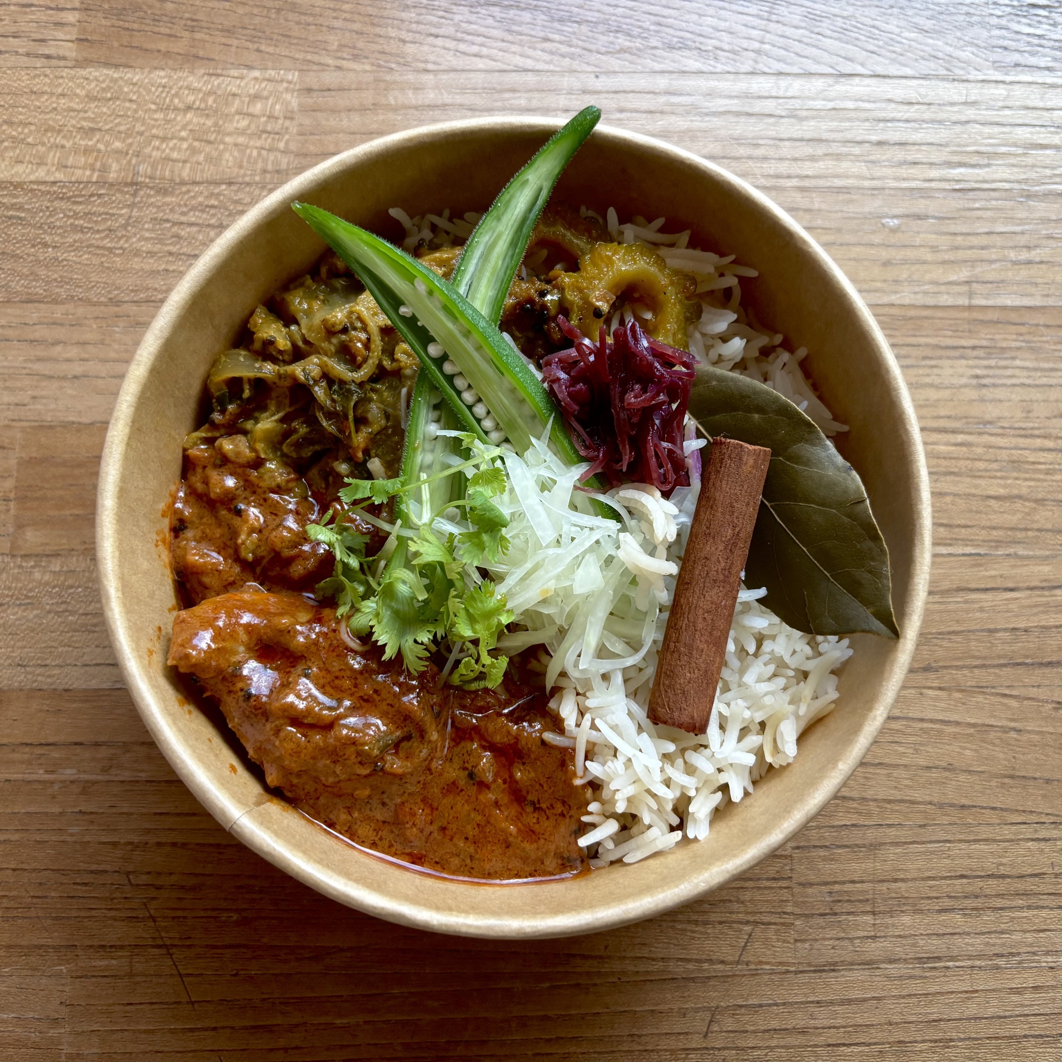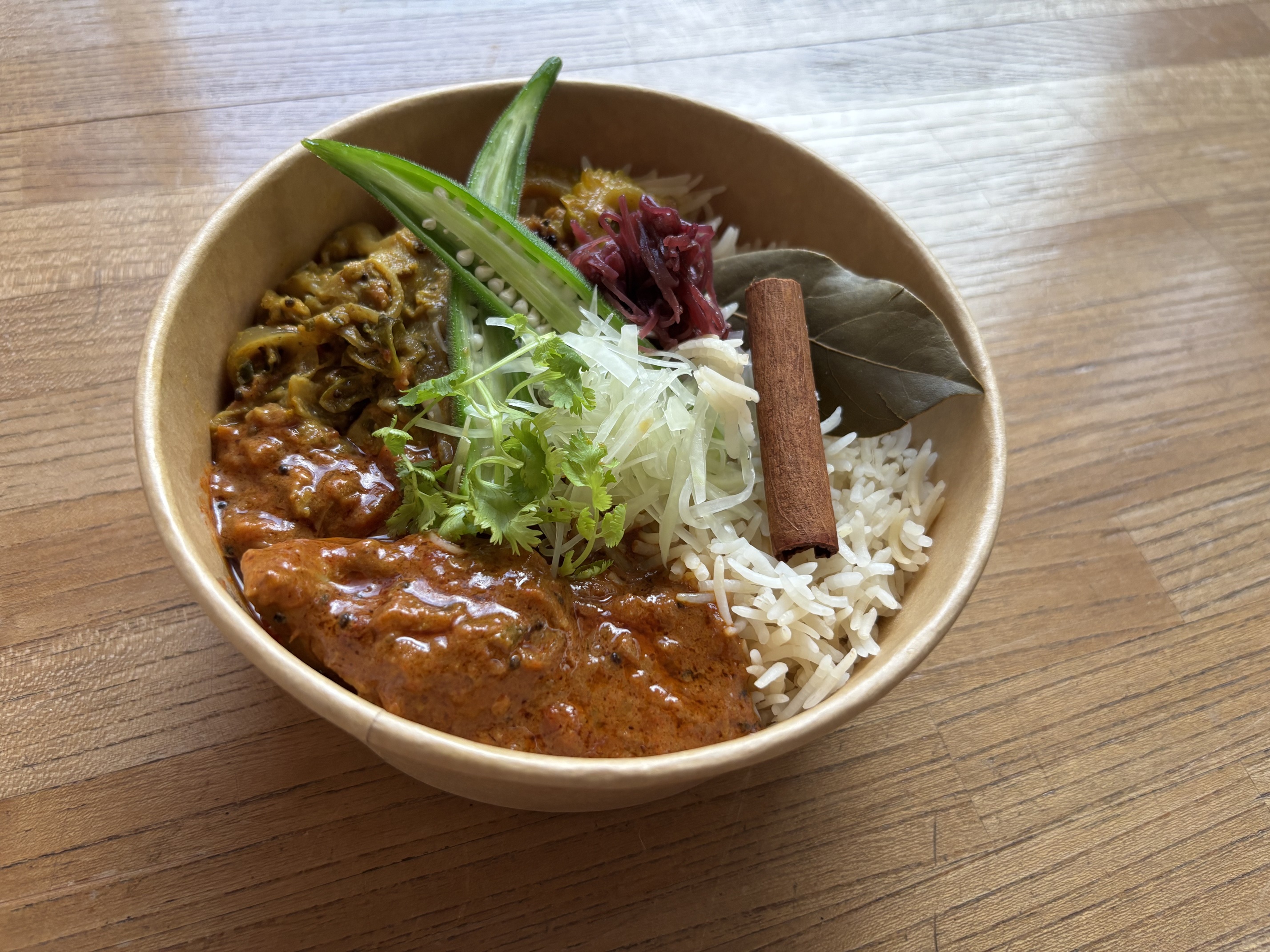 南インド料理やスリランカ料理でよく使われるカレーリーフやココナッツミルクを使った、王道のチキンカレーと甘酸っぱい野菜カレー。